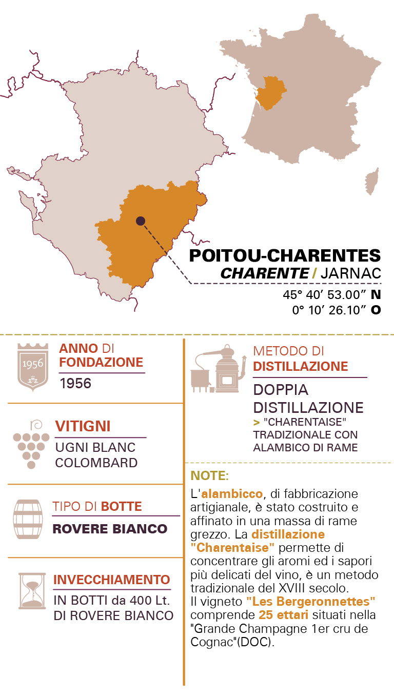 TIPOLOGIAAOC Grande Fine Champagne ZONA PRODUTTIVAJarnac MATERIA PRIMAColombard, Ugni Blanc DISTILLAZIONEUna volta raccolti i grappoli vengono disposti su graticci per estrarne il succo e la polpa. Questa tappa molto importante viene praticata lentamente in maniera ancestrale, con l’aiuto di antichi torchi a pistone ad acqua, i quali rispettano la pressatura degli acini per permettere il passaggio dei succhi attraverso le bucce. I vini prodotti vengono distillati con cura attraverso un alambicco, di fabbricazione artigianale, affinato in una massa di rame che è indispensabile per ottenere raffinate acquaviti. La doppia distillazione dei vini darà origine alla prestigiosa e incomparabile acquavite che è il Cognac. VITIGNOColombard, Ugni Blanc COLOREOro ambrato PROFUMOAl naso arriva un’esplosione di profumi con un crescendo continuo, tra cui si riconoscono aromi di frutta, sentori vanigliati e di noci. ABBINAMENTIDa degustare la sera in un momento di relax. SAPOREIn bocca è persistente, intenso e delicato allo stesso tempo. INVECCHIAMENTOMinimo 4 anni in botti di rovere.