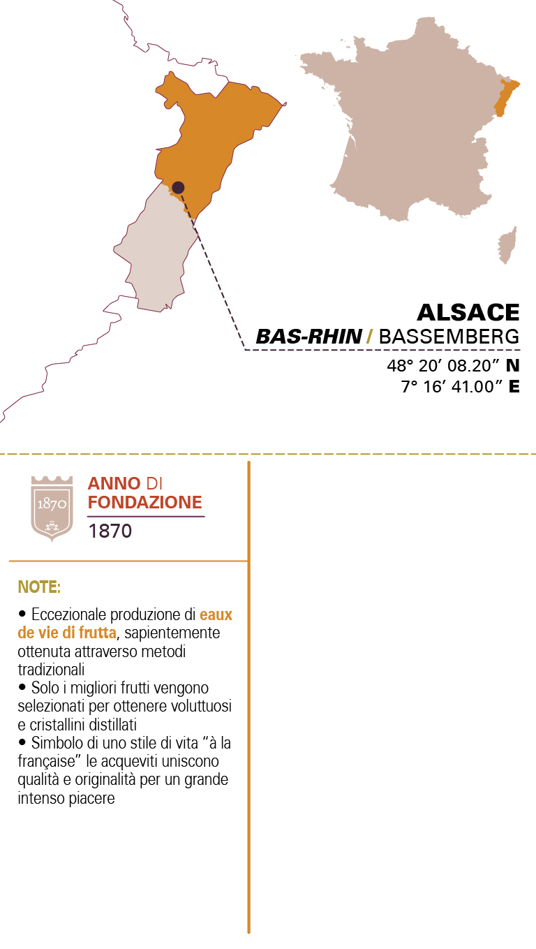 ZONA PRODUTTIVABassemberg MATERIA PRIMACiliegie DISTILLAZIONEDopo che le ciliegie hanno concluso la fermentazione all'interno di grandi tini, il succo estratto dai frutti viene distillato attraverso un alambicco di rame. COLORELimpido e incolore che può presentare riflessi gialloverdi con il suo invecchiamento. PROFUMOAl naso è intensa, con sentori dominanti di frutti rossi, seguiti da note di mandorla. ABBINAMENTIUn sorso di Eau-de-vie de Kirsch Vieux di Massenez a fine pasto può agire come piacevole digestivo, lasciando una piacevole chiusura dolce, con leggeri accenni di mandorla. Oppure gustato come distillato da meditazione. Davvero intrigante. SAPORENota di mandorla che si esprime non appena viene assunta in bocca ,complessa nota fruttata in cui la ciliegia fresca lascia il posto ad una consistenza aromatica più complessa e potente , nel finale una nota speziata. INVECCHIAMENTODai 2 ai 3 anni prima dell’imbottigliamento.