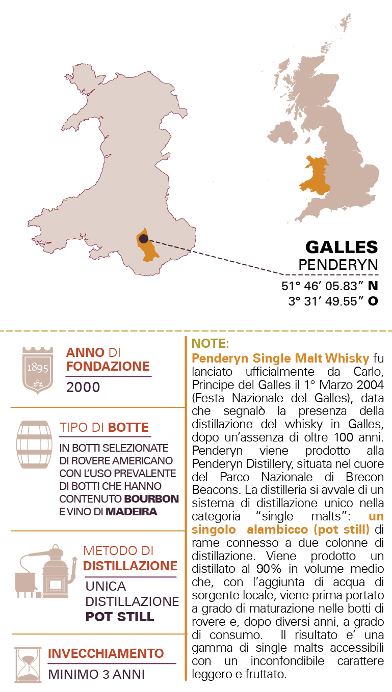 • NOTEDistillare in Galles era un'arte perduta, almeno fino alla fine degli anni ’90, quando, in un pub di un piccolo villaggio, un gruppo di amici inizia a ipotizzare la nascita di una distilleria in Galles, la prima da oltre un secolo. Il loro sogno era di creare un Whisky puro e prezioso, proprio come l’oro gallese, rappresentato dal “filone d’oro” caratteristico del brand. Il villaggio prescelto è quello di Penderyn: qui nasce la distilleria, dove viene installato un alambicco in rame progettato da David Faraday, discendete dal famoso scienziato del 19° secolo Michael Faraday. Nel 2004 il Whisky Penderyn vede ufficialmente la luce, alla presenza del Principe del Galles Carlo. L’attenzione ai dettagli, gli investimenti, la passione e il duro lavoro sono alcuni degli ingredienti che concorrono a creare grandi distillati: nel tempo Penderyn ha continuato la sua crescita e ha guadagnato stima in tutto il mondo, vincendo numerosi premi e diventando un punto di riferimento nella produzione di Whisky Single Malt.