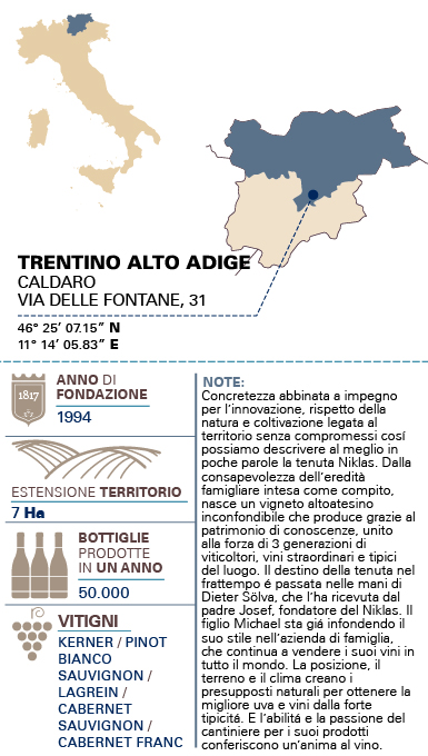 TIPOLOGIADOC Lago di Caldaro Classico Superiore ZONA PRODUTTIVACaldaro - Barleit, 400m s.l.m. VITIGNO100% Schiava TIPOLOGIA DEL TERRENOTerreno argilloso e ciottoli calcarei ETÀ DEI VIGNETIDa 30 a 40 anni VINIFICAZIONEDopo una breve macerazione a temperatura controllata, fermentazione a freddo in serbatoi di acciaio, e fermentazione ?nale a 18 °C. Fermentazione malolattica e affinamento in vasche d’acciaio. SISTEMA DI ALLEVAMENTOImpianto a pergola; viticoltura naturale integrata. COLORERosso rubino brillante. PROFUMOBouquet elegante e fruttato, con aromi di bacche rosse. ABBINAMENTICome vino classico dell‘Alto Adige, questo vino è adatto per quasi tutte le occasioni, perfetto abbinato a speck, salsicce e formaggi, antipasti estivi e piatti a base di pesce.