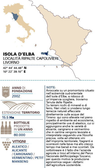 TIPOLOGIAIGT Costa Toscana Rosato ZONA PRODUTTIVACapoliveri Isola d’Elba VITIGNO100% Aleatico TIPOLOGIA DEL TERRENODi origine vulcanica (granito metamorfico) con una notevole dotazione minerale. VINIFICAZIONEDopo la vendemmia, a maturazione completa, le uve di Aleatico vengono pigiate e successivamente subiscono una soffice pressatura; il mosto viene fermentato a una temperatura controllata di 15-18 gradi C. COLOREIl colore di questo Rosato si avvicina alla rosa Tea. PROFUMORisulta molto fresco con i sentori tipici dell'aleatico, quali la rosa canina, la viola, la marasca, ma allo stesso tempo ricco del bouquet aromatico tipico della macchia mediterranea. ABBINAMENTIOttimo per l’aperitivo, è ideale per essere abbinato a un bel piatto di crudi di mare. SAPOREFresco, aromatico e fruttato in bocca, delicatamente equilibrato e di lunga persistenza.