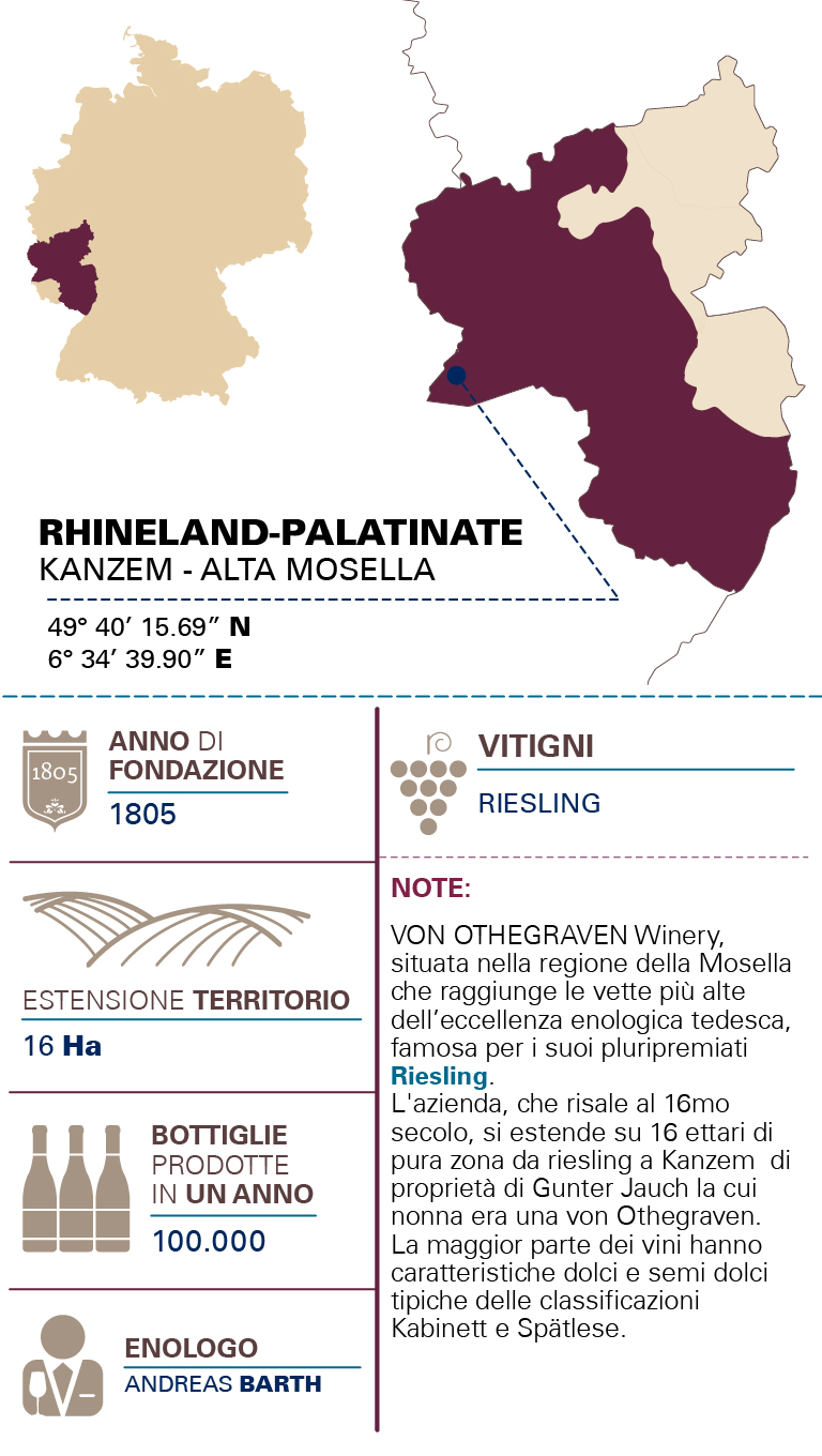 TIPOLOGIAMosel Qualitätswein ZONA PRODUTTIVAKanzem e Wiltingen VITIGNO100% Riesling TIPOLOGIA DEL TERRENOTerreno roccioso, minerale e ricco di ossido di ferro. VINIFICAZIONEDopo un'attenta selezione dei migliori acini, le uve vengono lasciate fermentare solo su lieviti naturali e successivamente vinificate in acciaio. COLOREGiallo paglierino chiaro PROFUMOAl naso aromi freschi di bacche rosse, fiori di sambuco, pera candita e delicati elementi floreali. ABBINAMENTIL'Altenberg Riesling Auslese risulta il perfetto abbinamento a fine pasto, quando saprà stupire gli ospiti con le sue note aromatiche davvero originali. In virtù della sua struttura, perfetto anche per accompagnare carne e formaggi. SAPOREAl palato, la frutta dolce è circondata dalla migliore muffa nobile. Acidità dominante e molto nobile. Succoso, vibrante, elegante, profondo e complesso. Finale molto denso con una delicata dolcezza barocca e molte note minerali.