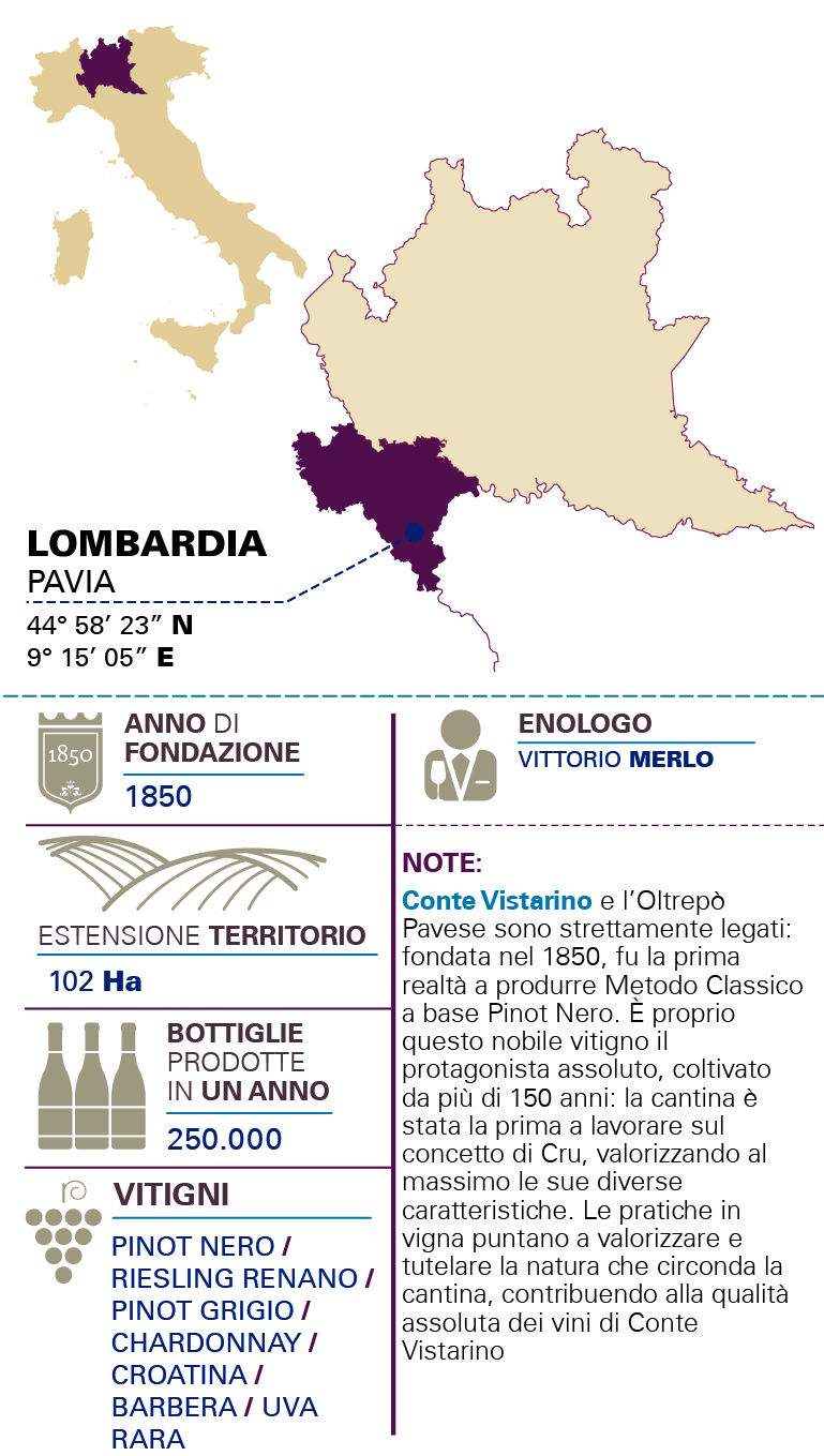 TIPOLOGIADOCG Oltrepò Pavese Metodo Classico Brut ZONA PRODUTTIVAOltrepò Pavese. Media fascia collinare, altitudine da 200 a 400 metri. VITIGNO80% Pinot Nero, 20% Chardonnay TIPOLOGIA DEL TERRENOSuolo argilloso-calcareo VINIFICAZIONELe uve, separatamente, sono raccolte manualmente in cassette da 20 kg e stoccate a 10°C in cella frigo prima della pressatura soffice. I mosti fiore (resa del 45%) vengono fatti fermentare in acciaio a temperatura controllata e dopo l'assemblaggio il vino base rimane sulle fecce fini di fermentazione fino al tiraggio effettuato la primavera successiva alla vendemmia. Dopo almeno 30 mesi sui lieviti si esegue la sboccatura con un dosaggio di zucchero di 7g/l. SISTEMA DI ALLEVAMENTOGuyot e Cordone speronato COLOREGiallo paglierino con riflessi luminosi. Perlage fine e abbondante. PROFUMOProfumo elegante, ampio, delicato con freschezza floreale e note balsamiche. SAPOREGusto fresco di agrumi, armonico elegante e buona struttura e mineralità. INVECCHIAMENTOAffinamento sui lieviti almeno 30 mesi.