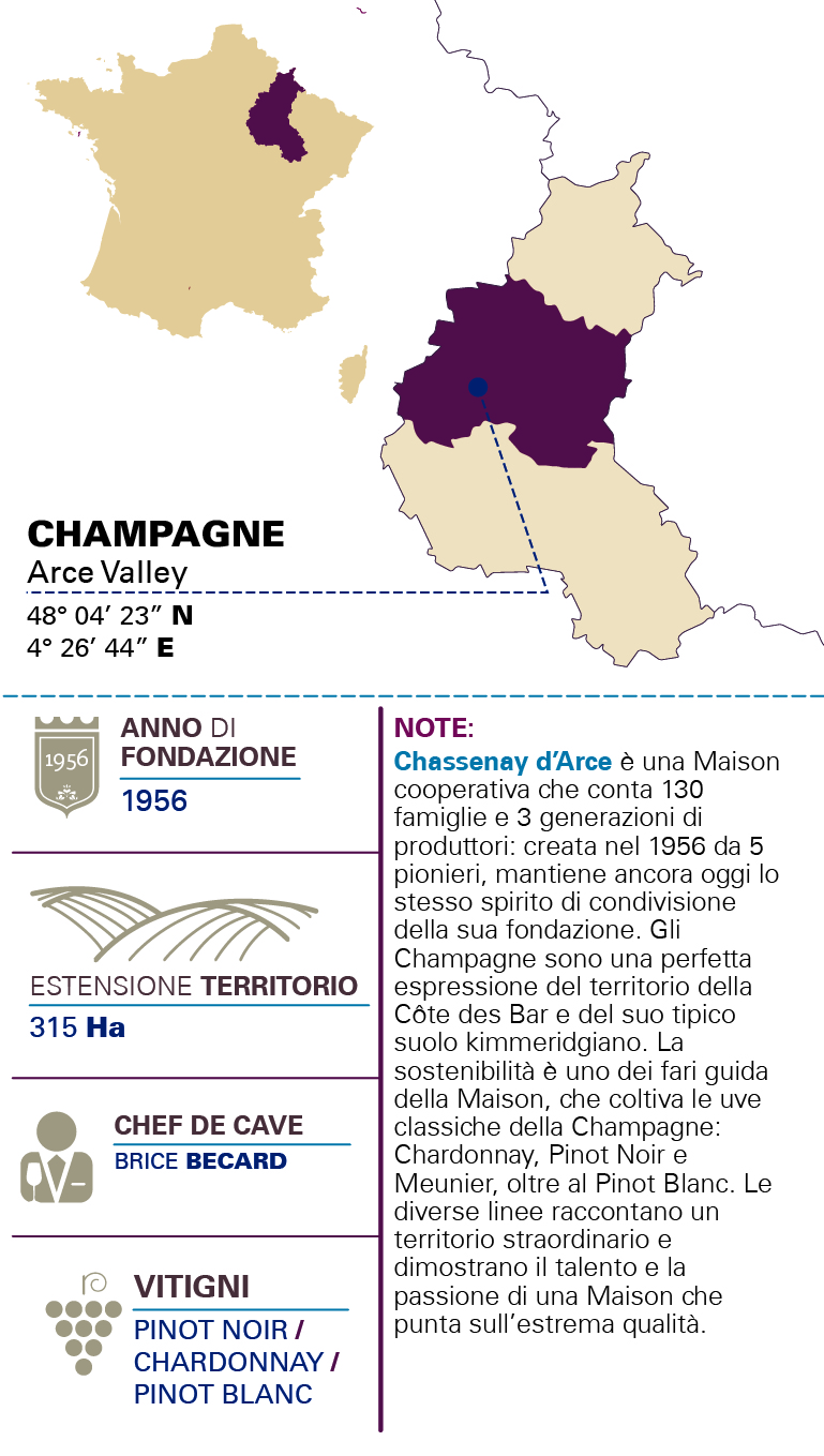 • NOTE«L'unione di pinot nero piuttosto imponente e di chardonnay più sottile dà vita all'iconica Cuvée Première, notevole per la sua generosità e finezza. Classico e complesso, porta la freschezza caratteristica del terroir della valle dell'Arce» - Brice Becard